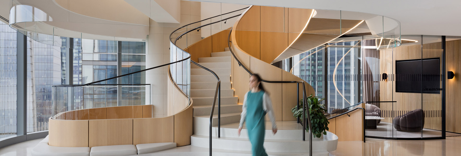 A dramatic spiral staircase anchors the design, connecting all four floors and serving as a striking architectural centerpiece—despite significant engineering challenges. Flexible solutions like sliding office fronts and Skyfold walls allow spaces to transform for large-scale events, while premium finishes, including Italian-sourced stone, elevate the aesthetic.